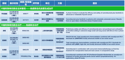 卡瑞利珠单抗联合AG百家乐医药的另一款创新药法米替尼在甲状腺癌和结直肠癌领域有2项研究被接收为壁报,另有卡瑞利珠单抗联合化疗的4项研究在肺癌、结直肠癌、头颈癌和阴茎癌领域的研究被接收为5份壁报。